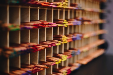 Close-up of a bunch of colored pencils, abstract background with colored pencils macro view