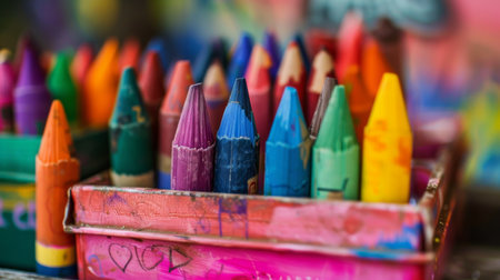 A close-up of a box of brand new crayons with vibrant colors, symbolizing creativity and childhood joy