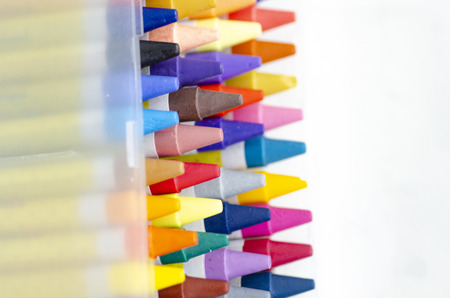 education and back to school concept, colorful crayons in the transparent box.selective focus shot and grain effect