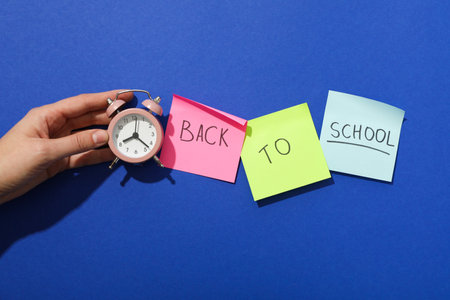 School chalkboard and stationery accessories, pencils, alarm clock and pens. Back to school concept, top view, blue background