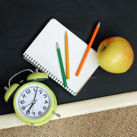 background with flat lay mechanical watches, colored pencils, autumn apple on the blackboard / Back to School