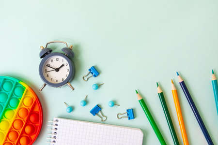 Stationery and alarm clock, pencils, pastel colored paper, on a green background, top view, the concept of learning, education, back to school, holidays
