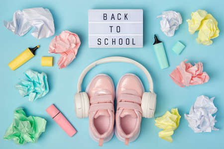 Back to school text on lightbox. Headphones, pink shoes, colored crumpled paper balls, marker on blue background. education concept. Flatlay Top view Still life.