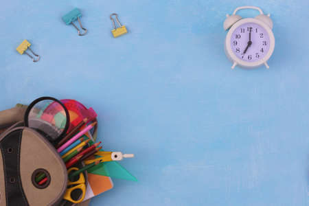 Composition of items for education. Pens, glue and alarm clock on a colored background.