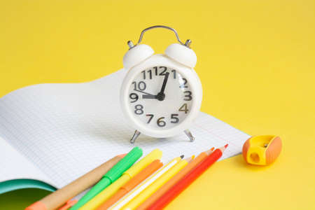 School alarm clock pencils markers notebook pen and sharpener on a yellow background
