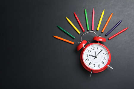 Alarm clock and colorful pencils on blackboard, flat lay with space for text. school time