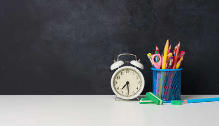 white round alarm clock and a metal glass with pens, pencils and felt-tip pens on the background of an empty black chalk board, copy space