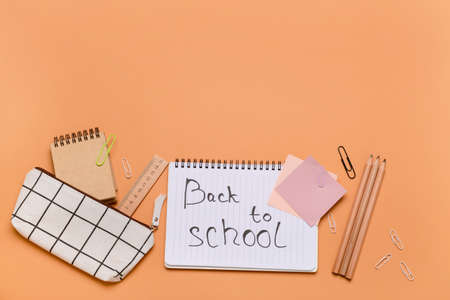 Stationery supplies with text BACK TO SCHOOL on orange background