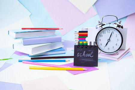 Back to school, alarm clock, open blank notebook, stack of books and pencils on bright background, learning concept, homework