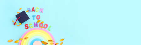 Back to school concept. Top view image of rainbow memo paper, graduation hat and text over blue background