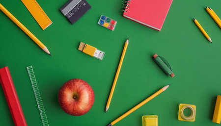 Stationery accessories on a green background. 1 September is the day of knowledge.