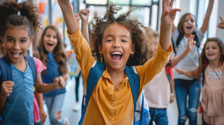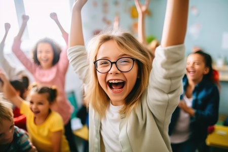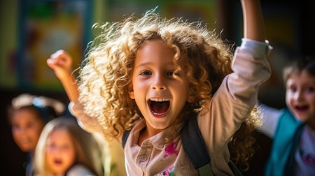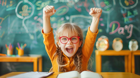 Delighted elementary school girl with arms raised in excitement expressing enthusiasm and joy for the happy school day in a vibrant and colorful classroom environment filled with educational elements