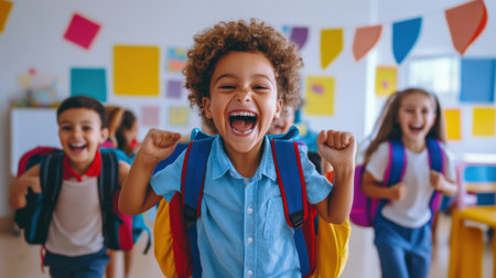 Joyful young students with backpacks celebrating the last day of school in a classroom setting