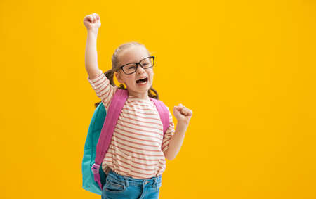 Back to school and happy time! Cute industrious child on color paper wall background. Kid with backpack. Girl ready to study.
