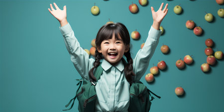 Excited young girl in school uniform lifts her backpack high, standing by the blackboard. Her bright expression and glasses reflect the joy of education and playful school spirit. Study banner