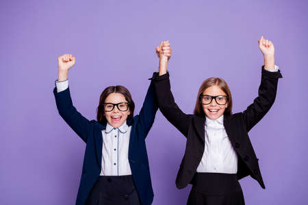 Portrait of delighted kids raise fists scream yeah wear jackets blazers eyewear, eyeglasses isolated over violet purple background