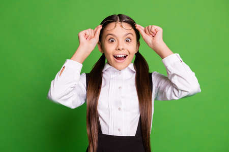 Weekend. Photo of little ginger schoolchild in front of blackboard celebrating, final examination best result in class wear denim overall pink shirt isolated green background