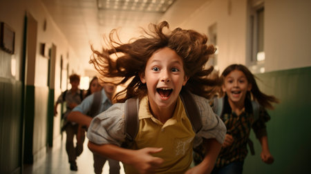 Cheerful children run along the corridors of the school. Generative AI