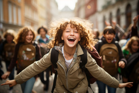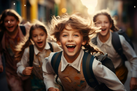 A lively group of children joyfully running down the street together, kids running school, AI Generated