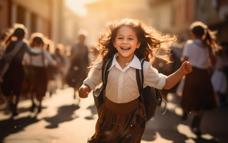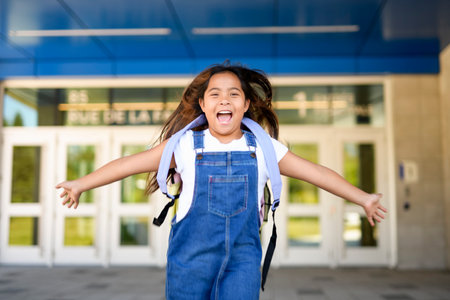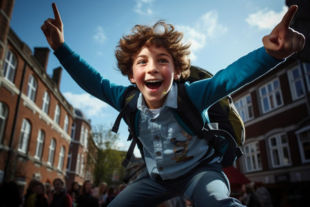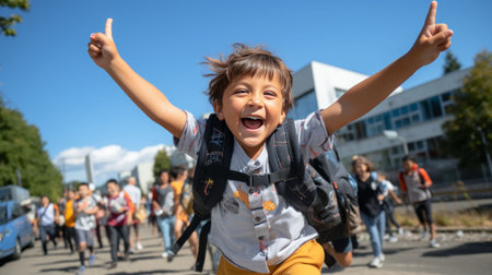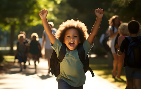 A joyful young child returning from school with arms raised in celebration. Ai generated