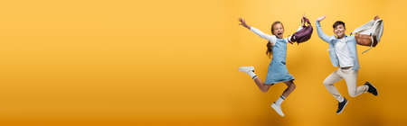 Excited interracial schoolkids with backpacks jumping on yellow background, banner