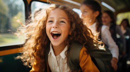 Joyful ride: fun students on a school bus, sharing laughter and creating memories on their journey to school, embodying the spirit of friendship and adventure during their commute together.