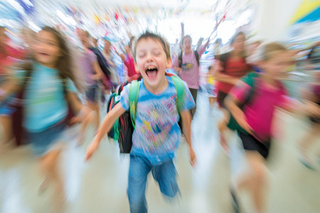 Laughing kids run through the school's hallways.