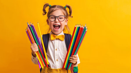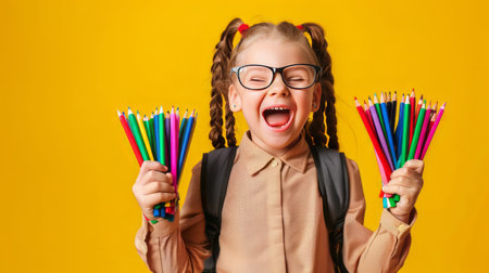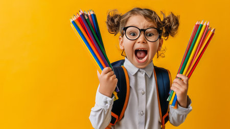 School child in glasses in school uniform holds colored pencils. Banner. emotional surprise face