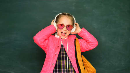 Teenager younf school girl with wearing eyeglasses backpack and headphones.
