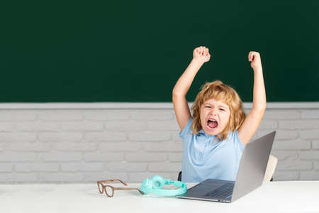 Elementary school kid angry and sad. Pupil screaming shouting in classroom. Bad school boy.