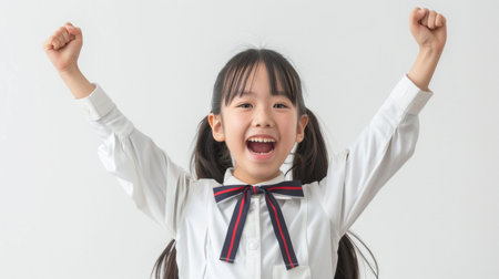 a Japanese girl in a white school uniform, showing excitement on a white studio background