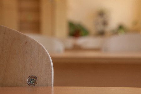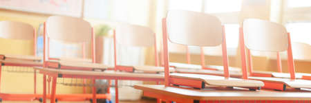 morning sunshine on desks and chairs in empty classroom - waiting for students to come in