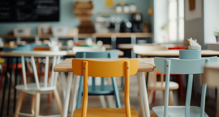 A collection of colorful chairs arranged around wooden tables in a contemporary cafe. The soft light of daytime streams through the windows, creating a warm and inviting atmosphere.