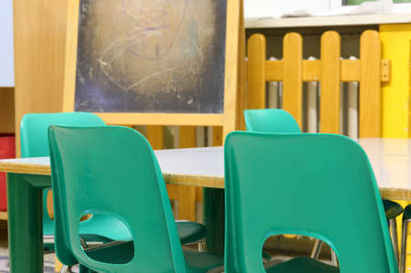 interior of a classroom in elementary school without children with small green plastic chairs and the blackboard on the background