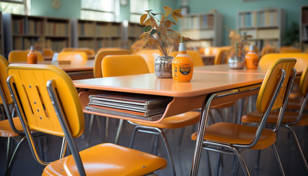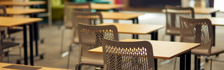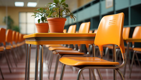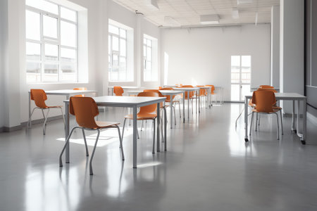Empty contemporary classroom, devoid of occupants, showcasing modern educational environment and design elements