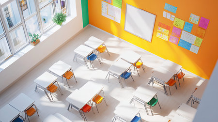 A bright classroom bathed in natural light, featuring wooden desks, a chalkboard, and colorful decorations, perfect for fostering a creative learning experience.