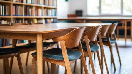 A serene library space featuring wooden tables and chairs, surrounded by shelves of books, ideal for quiet study sessions or group discussions in a modern setting.