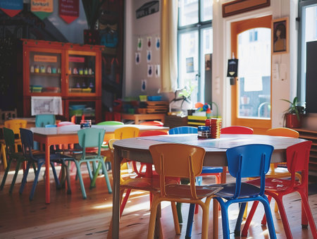 A lively classroom featuring colorful chairs and round tables, filled with various educational materials and activities, creating an engaging learning environment.