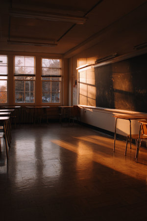 Evening light in a quiet classroom, casting long shadows across organized rows of desks