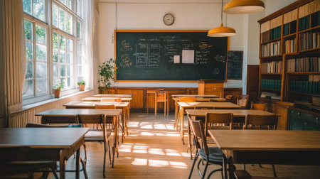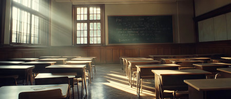 Quiet classroom with empty desks and sunlight filtering through windows during learning time