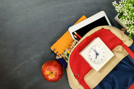 Back to school concept. Backpack with school supplies, clock, tablet and apple against chalk board. Top view. Copy space