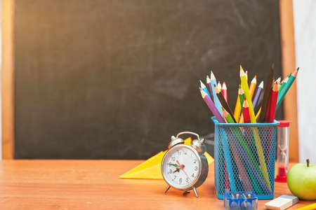 school still life, alarm clock, stand for pencils on the background of a school board, university, college