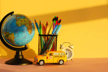 the concept of education and return to school. Stationery in a glass, a globe, an alarm clock and a toy car school bus on the table on a yellow background