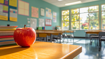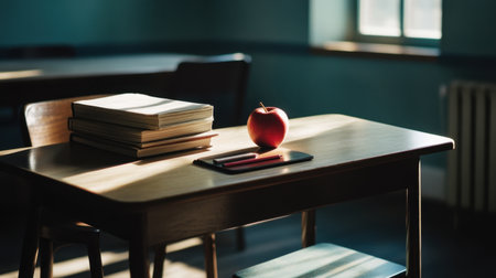 A serene classroom scene featuring a desk with stacked books and a single apple, bathed in warm, inviting light, perfect for depicting educational themes and inspiration.