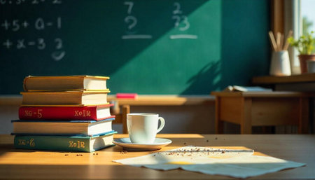 Classroom scene with books, coffee, and chalkboard background
