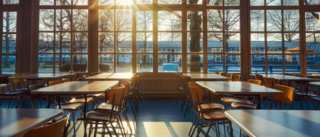 A Room With Tables and Chairs, An empty classroom bathed in the soft glow of sunrise, AI Generated