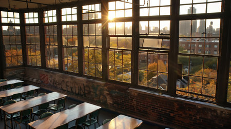 Classroom in background without ,No student or teacher . with Sunset limelight near window.