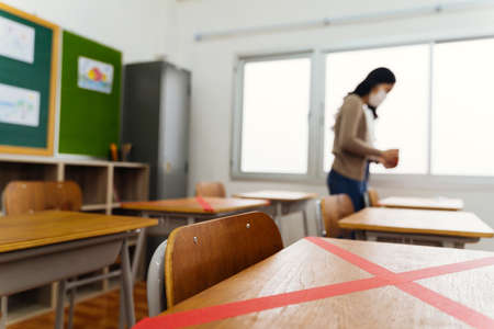 Female teacher using a red tape on the desks in classroom in primary school to keep social distancing measure policy in education building for Covid19 new normal concept.