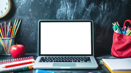 There is an open laptop with a white screen, a red bag, notebooks, an apple and a basket of pencils on the table next to the black chalkboard. Laptop mockup. Education and training. Discounts and sales of school supplies. Website presentation