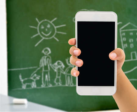 hand of child is holding a modern smartphone with blackboard and a drawing of a child on the background